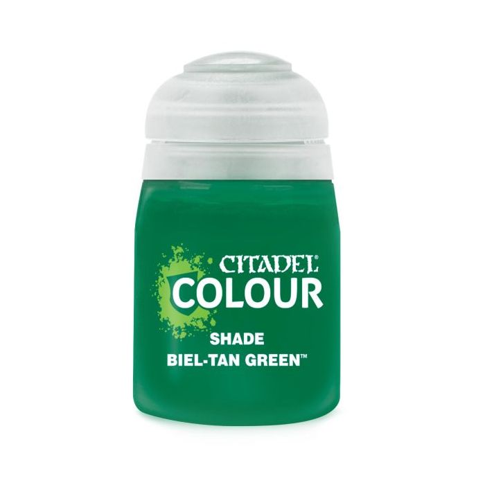 1 баночка акрилової фарби Citadel: Shade: Biel-Tan Green містить 18 мл фарби.