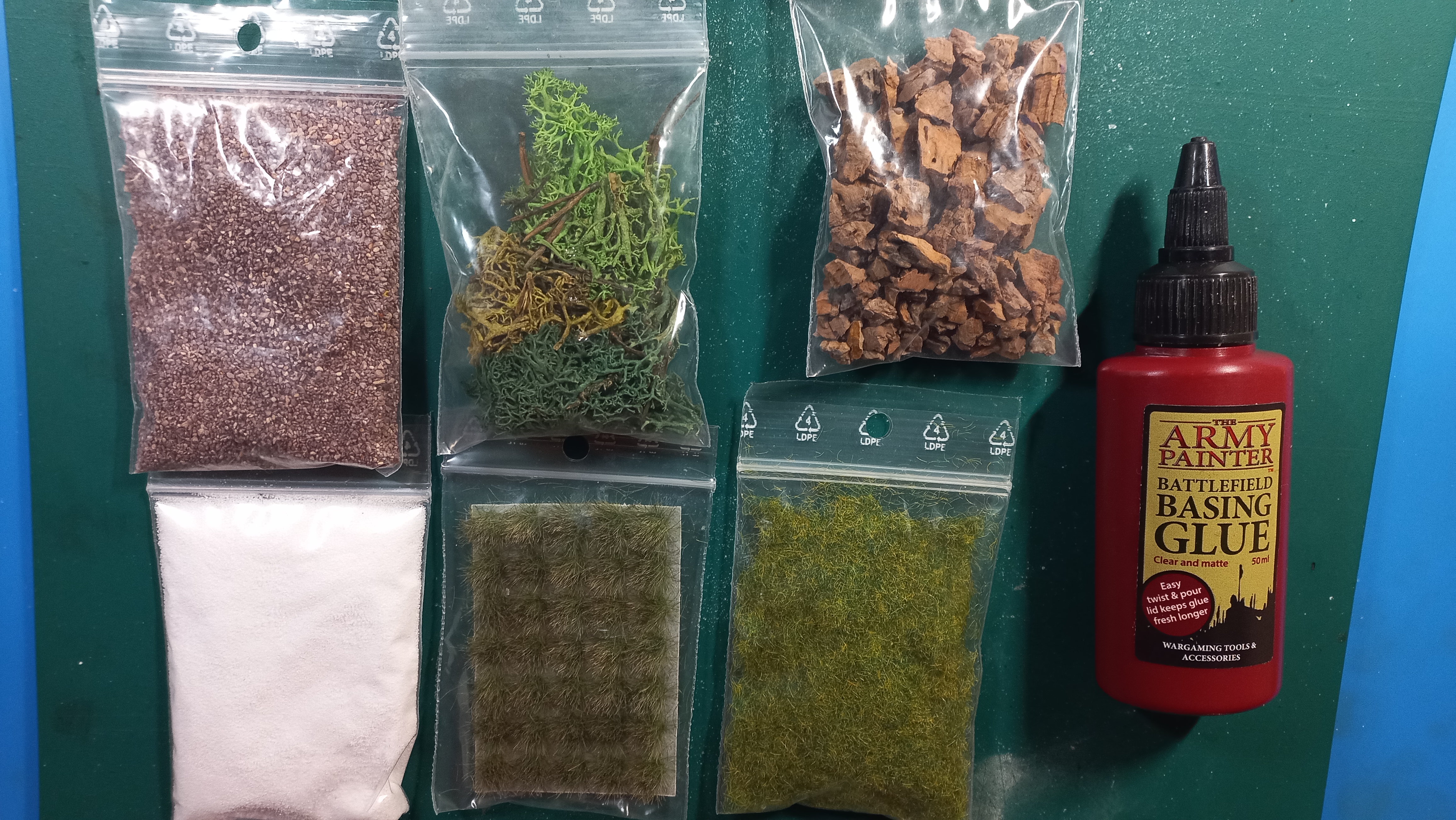 У наборі все що потрібно у невеликій кількості для оформлення баз-підставок для мініатюр та елементів терейну. Все відповідає опису продукції від Army Painter. У комплекті є клей схожий на ПВА - але однозначно високої якості.