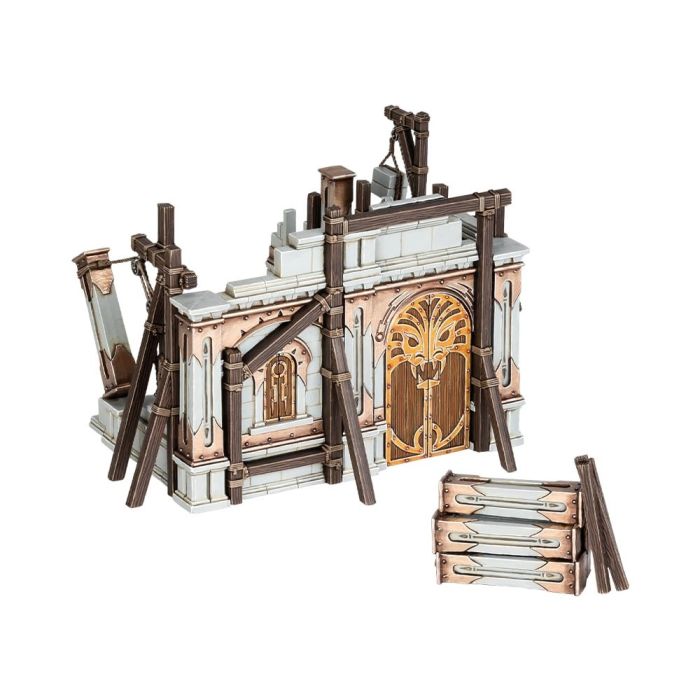 Модель зображає каркас будівлі з лебідкою та стосом колон — ідеальний елемент для створення сцени активного будівництва. Деталізовані мотузки, риштування й блоки додають глибини та реалізму ігровому столу, а можливість комбінування з іншими наборами дозволяє сформувати власне молоде поселення, за яке зійдуться армії та загони.