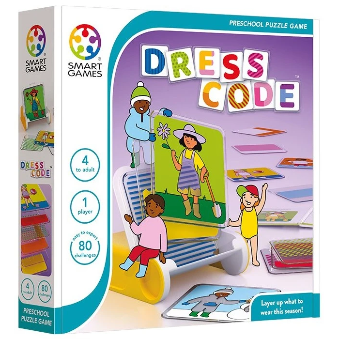 Dresscode — це яскрава дитяча настільна головоломка, у якій коробка одночасно слугує ігровим полем, а весь ігролад зосереджений на логіці, уважності та візуальному сприйнятті. Гра створена так, щоб дитина в ігровій формі вчилася аналізувати завдання, планувати свої дії та знаходити єдине правильне рішення, отримуючи задоволення від процесу, а не стрес від помилок.