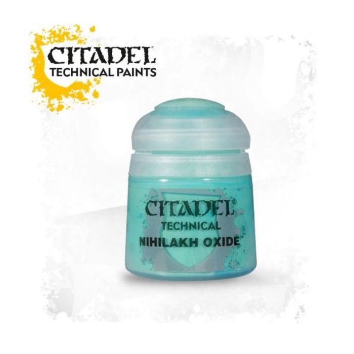 За допомогою технічної фарби Citadel Nihilakh Oxide ви можете надати обладункам, зброї, щитам та іншим металевим предметам особливого вигляду. Ця досить рідка фарба дозволяє створювати реалістичні ефекти, такі як окислений або застарілий метал (verdigris) на ваших моделях та мініатюрах. Ви також можете використовувати її для створення ефекту марева.
