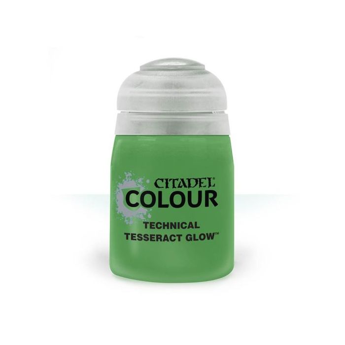 За допомогою технічної фарби Citadel Tesseract Glow ви можете створити вражаючі ефекти світіння на ваших мініатюрах та моделях. Цей майже неоновий зелений колір пропонує безліч можливостей, щоб зробити зброю, машини, камені або магічні об'єкти ще більш вражаючими. Tesseract Glow найкраще наносити на біле або світле тло. Залежно від способу нанесення, колір буде жовтим або зеленим.