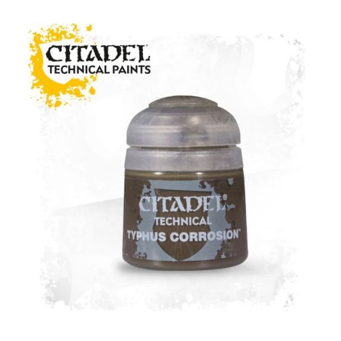 За допомогою технічної фарби Citadel Typhus Corrosion ви можете додати ефекти корозії та атмосферних впливів на ваші моделі та мініатюри. Ця спеціальна фарба містить дрібні гранули. Після висихання вона залишає зернисту текстуру.